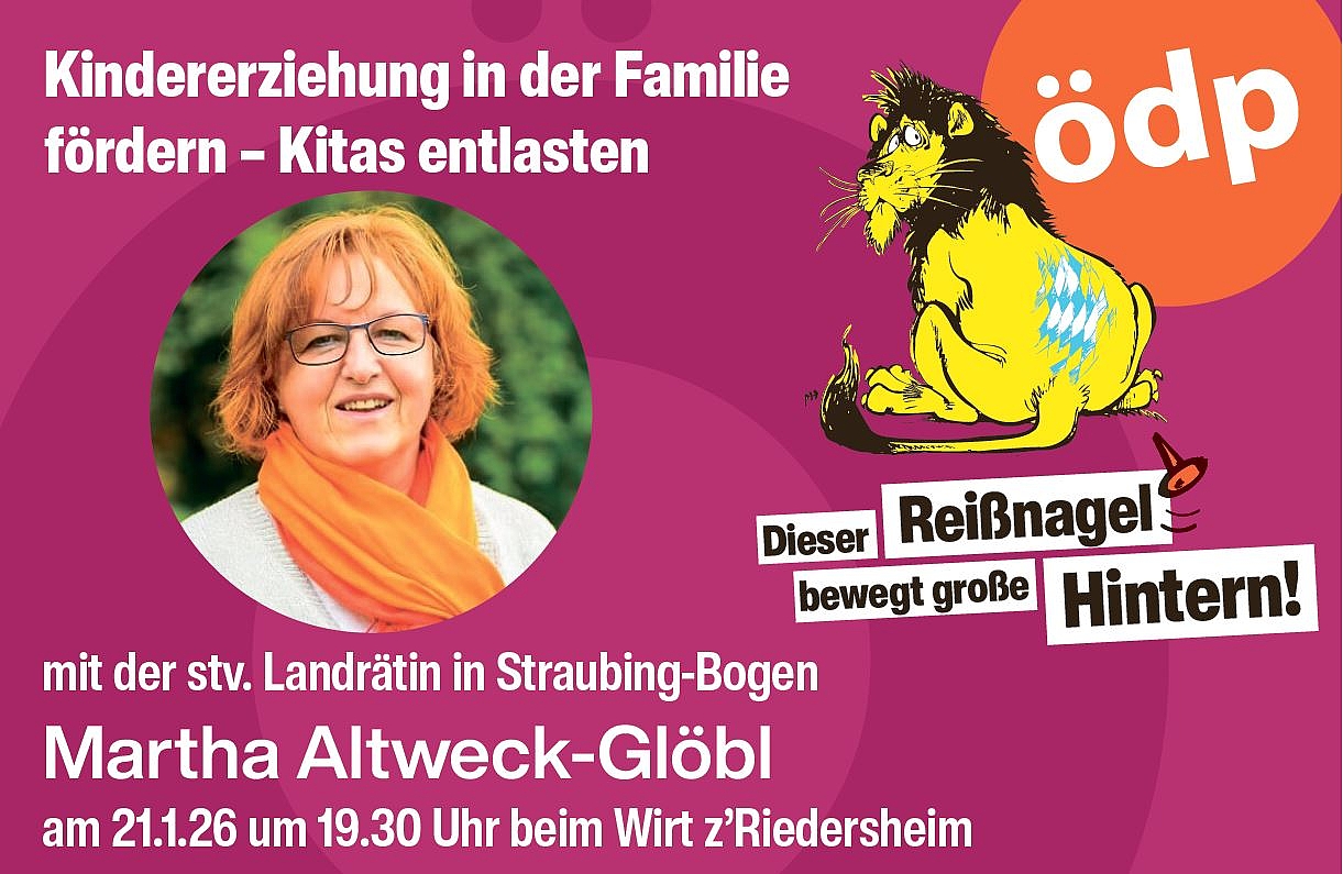 Die Diplom Sozialpadagogin Altweck-Glöbl zeigt an diesem Abend wie schwer es den Familien gemacht wird, den Kindern ausreichend Zeit für eine gute Betreuung zu schenken. So hat der bayersche Landtag das Familiengeld abgeschafft und jetzt auch das Kinderstartgeld gestrichen. Gleichzeitig konnen trotz Rechtsanspruch nicht ausreichend Plätze in den Kitas zur außerfamliären Betreuung zur Verfügung gestellt werden. Altweck-Glöbl beschreibt den Ansatz der ÖDP durch eine bessere Familienförderung gleichzeitg Kitas zu entlasten. Der Eintritt ist frei.