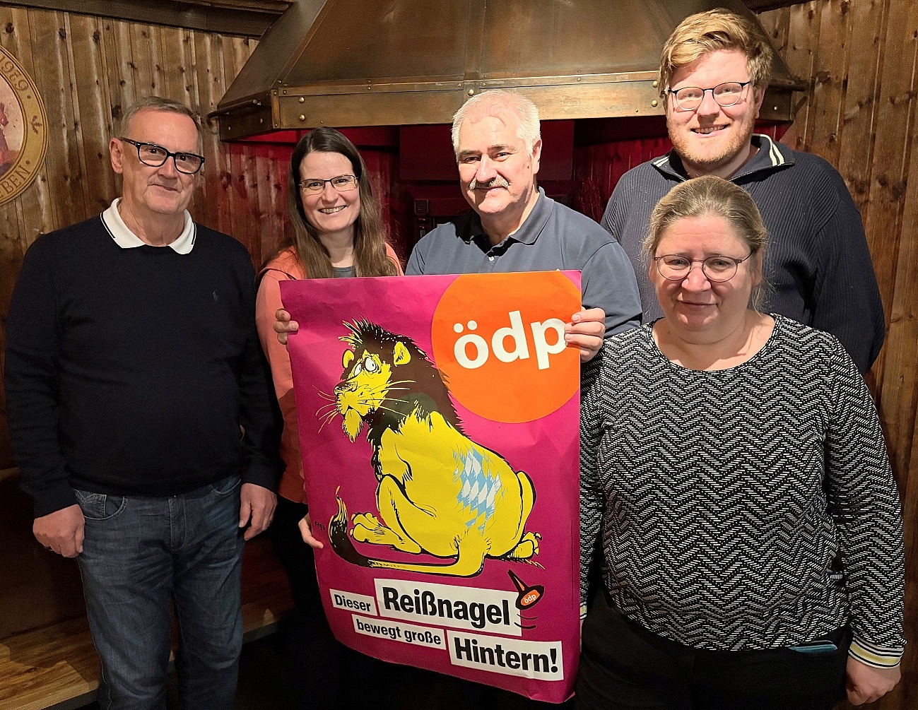 Einstimmig wiedergewählt wurde der ÖDP Ortsvorstand Erding mit den Ortsvorsitzenden Eva-Maria Döllel (rechts unten), Felix Mayr (rechts oben) und den Beisitzern Georg Gschlößl (l), Dr. Josephine Arnold(2.v.l), Wolfgang Reiter (3.v.l), Christina Treffler (nicht im Bild) und Helmut Trinkberger (nicht im Bild). Alle wiedergewählten Ortsvorstände auf dem Foto und die nicht anwesende Christina Treffler werden auch 2026 auf den Spitzenplätzen der ÖDP-Stadtratsliste zu den Kommunalwahlen für den Erdinger Stadtrat kandidieren. Sie wollen wieder wie in den vergangenen 6 Jahren der Reißnagel sein, der auch dicke Hintern bewegt: für Familien, Naturschutz, ÖPNV und eine nachhaltige Stadtentwicklung, die die zunehmende Klimaerwärmung mitbedenkt.