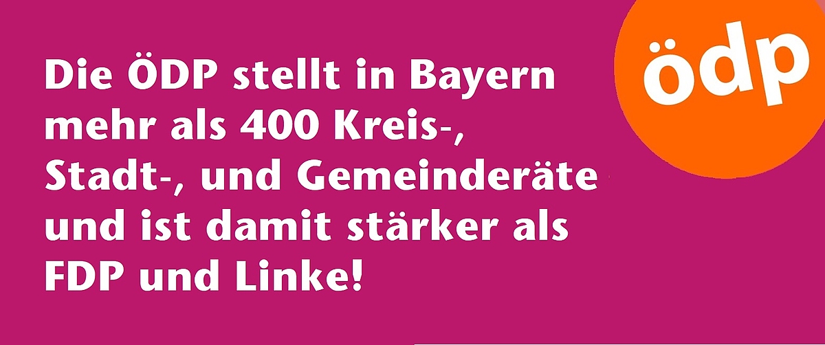 Die ÖDP hat in Bayern über 400 Kreis,- Stadt- und Gemeinderäte. Sie hat damit mehr kommunale Mandate als FDP oder Linke !!! Die ÖDP hat in Bayern 5 Bezirksräte. Die ÖDP stellt 6 Bürgermeister in Bayern, 11 zweite und dritte Bürgermeister und sogar eine stellvertretende Landrätin!